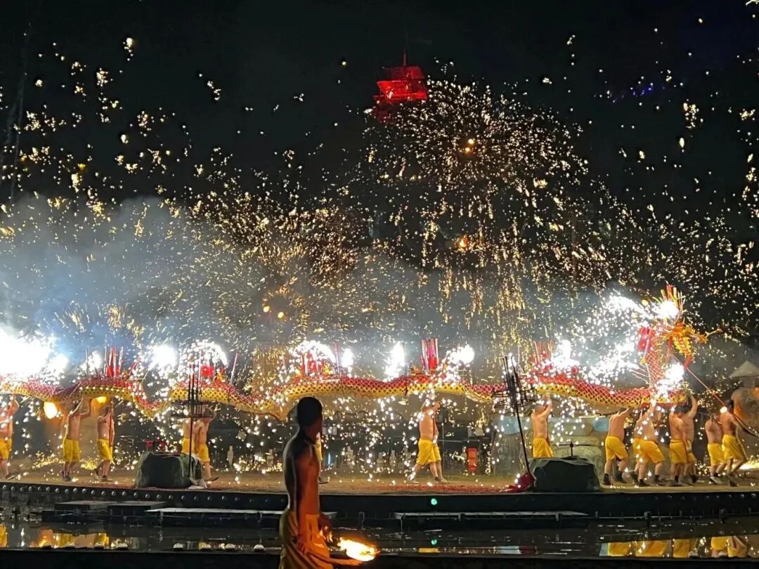 梅州市年夜寶山游玩度假區實景表演《千年火龍》劇目,舞臺以整座茶園為佈景,演出國度級非遺項目埔寨燒火龍風俗文明節目及非遺項目“打鐵花、煙花秀”等。